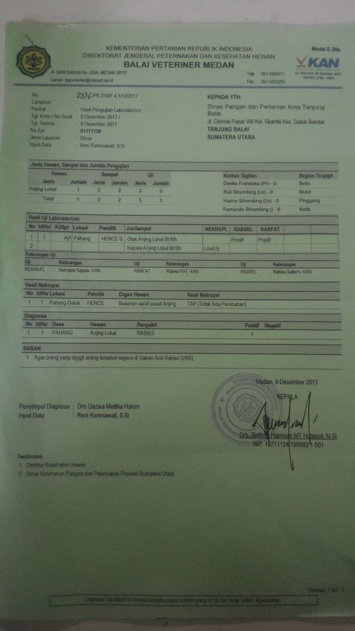 Dari hasil uji laboratorium Balai Veteriner Medan, menyatakan Hasil uji lab. Rabies pada penggigitan Anjing di Kelurahan Pahang pd tgl 02 Desemeber – 04 Desember 2017 Hasilnya positif rabies.